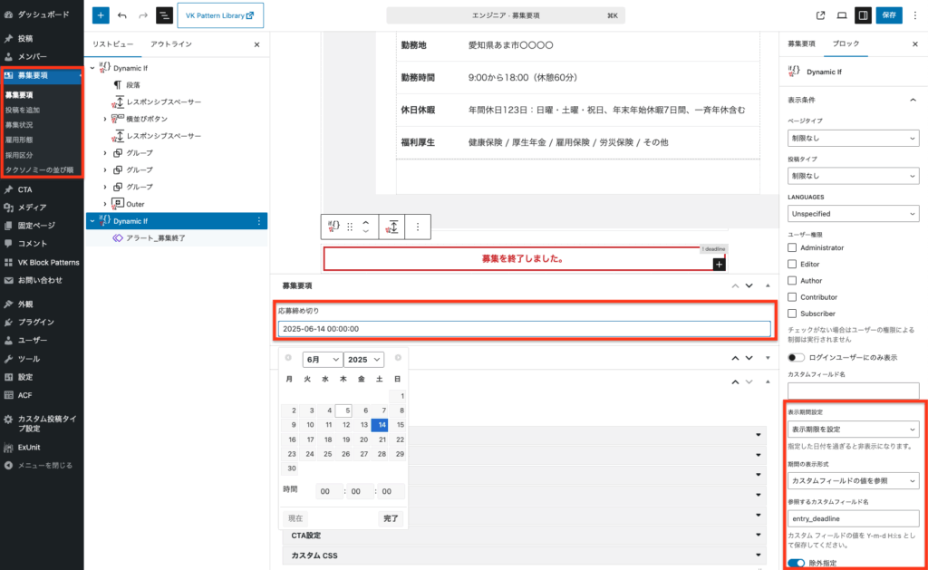 募集要項専用の投稿タイプ「募集要項」が用意してあります。その投稿の中で VK Dynamic If ブロックを使用して、応募締め切り日を過ぎると表示を切り替えています。